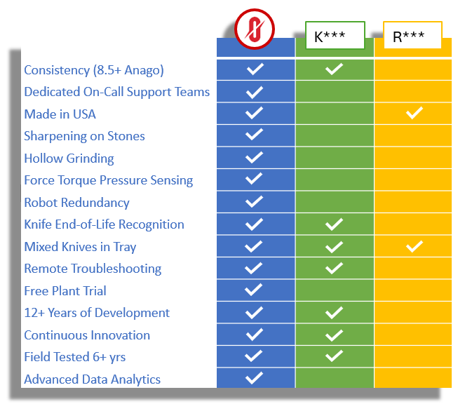 Everyone in the industry knows it’s moving to automation and robotics, but nobody knows how to transition or who to partner with. Start with the backbone of your plant - knives. We know processing and we know robotics and hold to the highest standards of customer service. In a business where many drop products off and skedaddle, we hang around to ensure our customers get the most out of our technology and relationship.